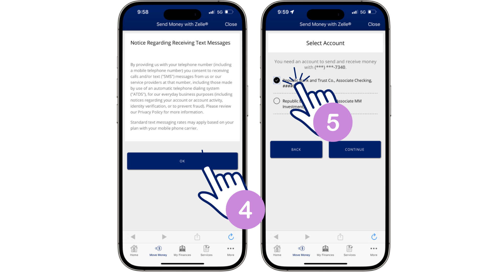 4. If you selected to enroll a U.S. mobile number, you will receive a Notice Regarding Receiving Text Messages. Review the notice, then select "OK" to select your account to send and receive money and "Continue".